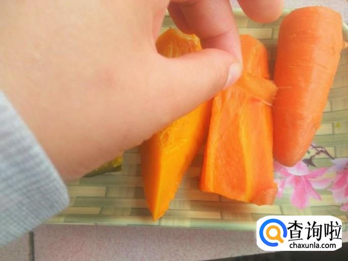 南瓜和胡萝卜蒸好之后,取出来放凉,趁热的时候,要记得把胡萝卜的皮去掉,很简单的,胡萝卜蒸熟之后,用手轻轻一撕就能把胡萝卜皮撕下来。