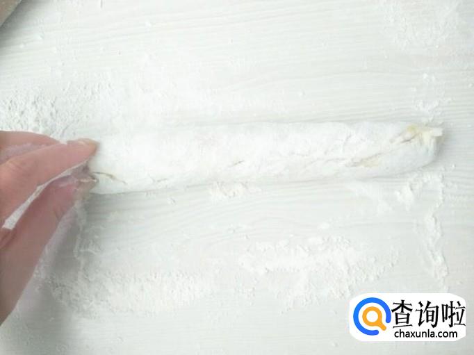 用手把面片卷起来,两头捏紧,然后搓成长圆条。