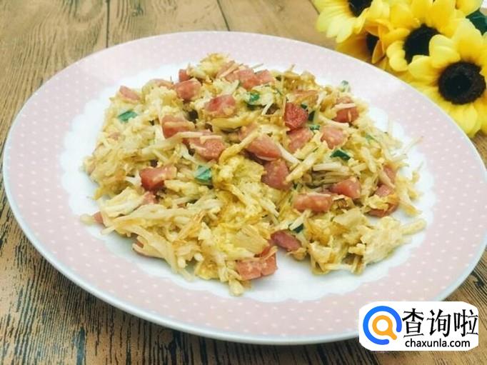 金针菇热狗煎蛋,金针菇洗净后切成丁,鸡蛋打入碗中加入适量的生抽,搅拌均匀,热狗切成丁,锅中倒入适量油,油热倒入金针菇翻炒,再倒入热狗翻炒到有香味,再淋入蛋液,蛋液凝固即可。