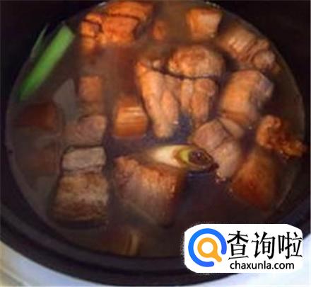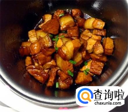 大概十五到二十分钟后肉就煮好了,加入几块冰糖进去,盖上盖子继续煮,一般五分钟左右冰糖融化,将红烧肉装盘,撒点葱花就可以吃啦。