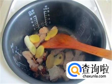 电饭煲清洗干净,把肉放进去,然后放入几片生姜和小葱,再放入一个八角和几瓣大蒜。