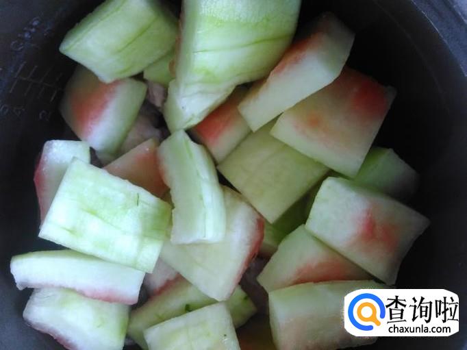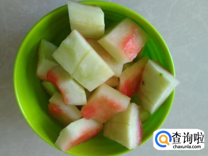 把猪肉切成大方块,西瓜皮削去表皮,然后也切成厚块。