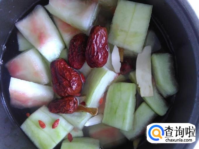 加水,水和食材的比例是1-1。【因为西瓜皮含水份多,煲的途中会出很多水份所以不要放太多水】