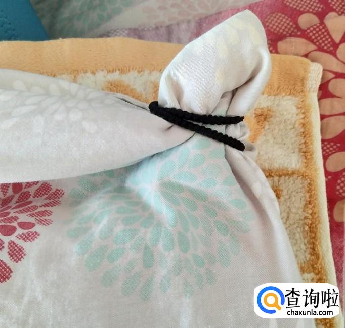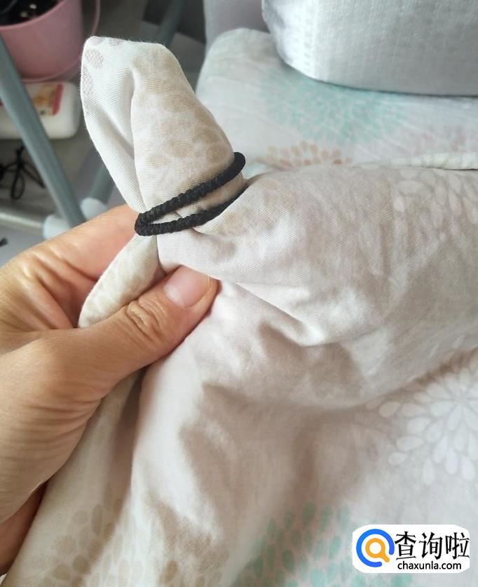 准备好后,将棉被的一角装进被罩里,把这一角整理好后,用发圈将这个角固定。
