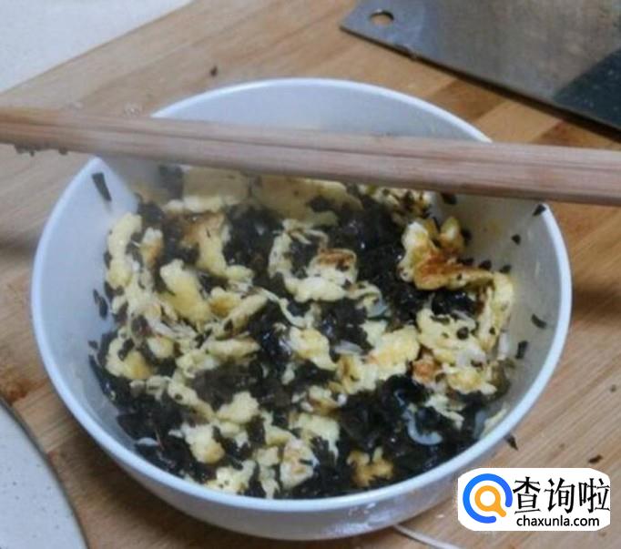 把炒好的鸡蛋和碎木耳给混合在一起,加入盐,鸡精,香油调料充分搅拌,让馅儿更有味儿,更好吃.