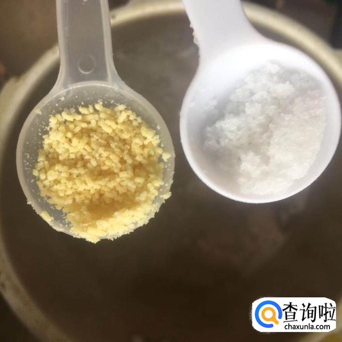 然后往锅中加入适量的盐巴和味精,如下图所示。