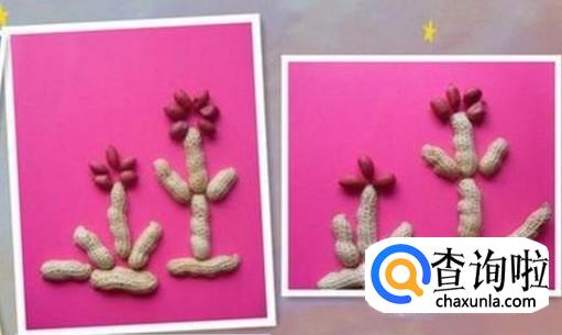 准备一张卡纸,将两个花生壳竖着排成一排,再在这排花生壳的中间,斜着左右两边各方一个花生壳,接着再竖排花生的顶部放三颗花生米,一颗仙人掌就出来了。