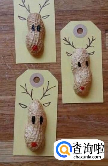 将一个花生壳用胶水贴在一张卡纸上,然后用彩色画笔画麋鹿的眼睛、嘴巴,再在卡纸上画麋鹿的耳朵和鹿角就可以了。