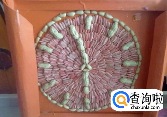 先用一张卡纸折成一个框,然后将胶水涂在卡纸上,1个花生壳代表一个时间,中间用瓜子仁排成一个圆圈,用一个花生贴在圆圈处,表示时针,再用3个花生壳竖着排一排,贴在圆圈处表示分针。为了让时钟更美观,我们可以在空白的地方贴满瓜子壳。