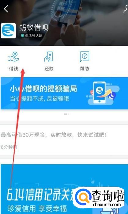 最后搜索找到蚂蚁借呗,然后点击借钱。这个时候你的信用额度就有了,如果你不开通网商银行是没有信用额度的。