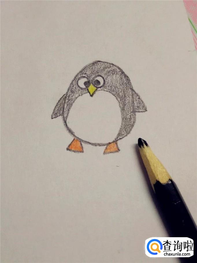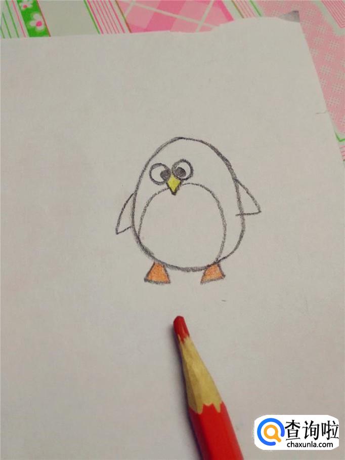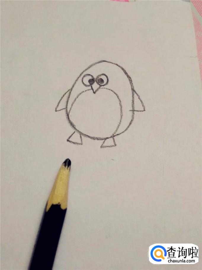 再用黑笔在身体的下面画两个小三角形,是企鹅的脚。到这步,企鹅的轮廓就画完了。