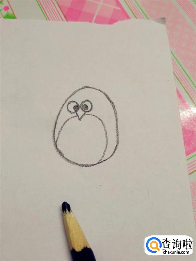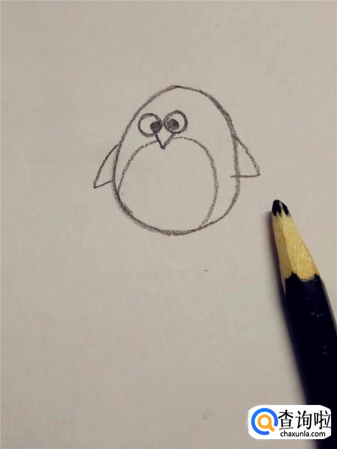 在嘴的下边,用黑笔画一个圆,圆的下边和企鹅的身体边缘线重合,这个圆就是企鹅的白肚皮。