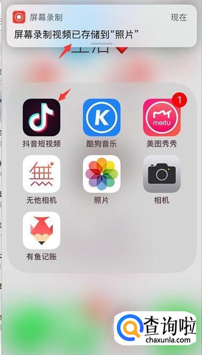 当屏幕录制完成后会显示视频已存入相册,然后我们打开抖音。