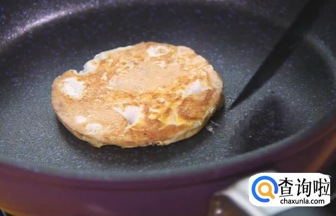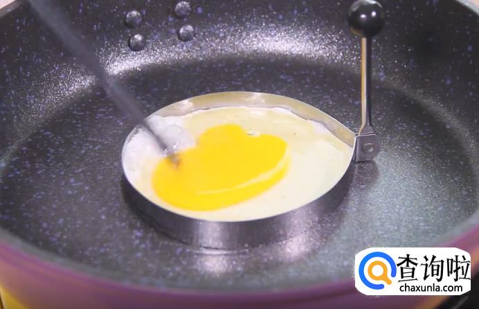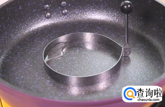开火热锅,将煎蛋模具放在锅中,倒入适量油在模具中,将鸡蛋打进去,煎至底面凝固后,脱离模具,将鸡蛋翻面。