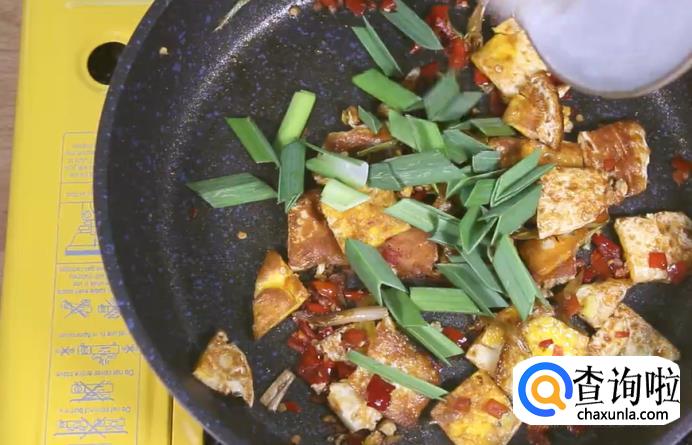 起锅热油,将切好的葱白倒入进去翻炒爆香,再加入一勺剁辣椒,继续混合翻炒。