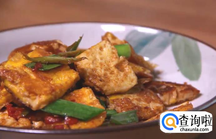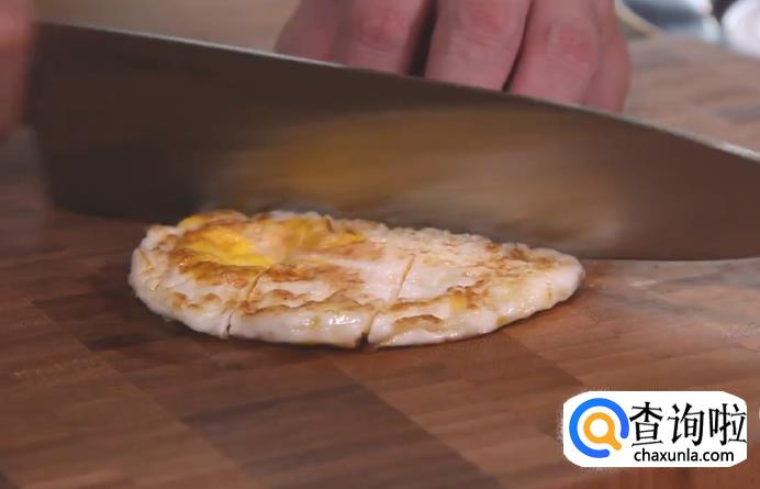 当鸡蛋两面微焦时将其捞出,一共煎3个鸡蛋。将煎好的鸡蛋用“井”分法切成块,放在一旁备用。