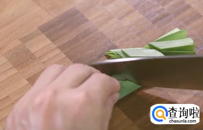 首先,将准备好的青蒜一刀分为蒜白和蒜叶两部分,再斜切成片,装碗备用。