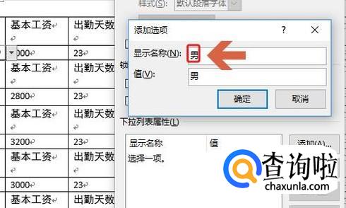 添加之后该对话框下方会显示这两项,如图一...点击确定以后返回到文档,再次点击性别下拉按钮即可看到男和女这两个选项了,设置完这个我们复制粘贴到其他需要添加下拉菜单的位置即可;