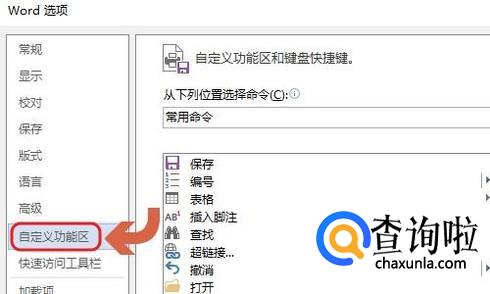 然后在弹出的Word选项对话框,我们选择左侧的“自定义功能区”,然后在右侧对应的页面里勾选“主选项卡”,见图二;