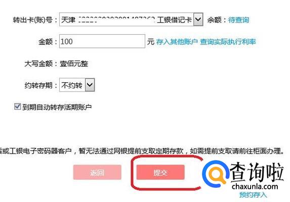 系统会自动选择您的工行借记卡,只要卡里有余额,就能购买定期了,我们点击提交,就购买成功了。这样,我们就成功把活期转成定期了。
