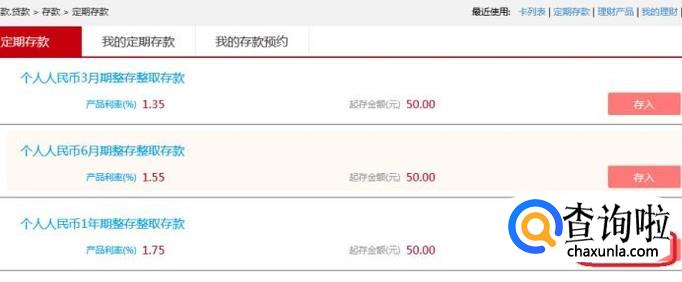 此时,我们能看到网上银行能办理的定期产品列表,如图所示,不管是利率还是产品,和在银行柜台办理都是一样的。我们选一年期的定期,点击“存入”。