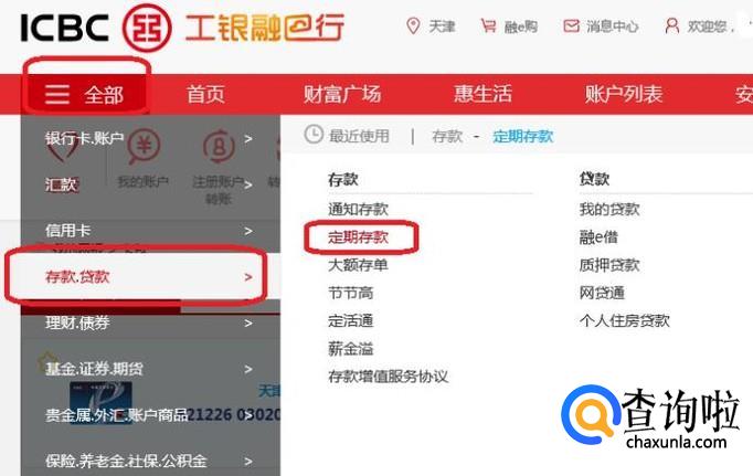 登录之后,就进入了个人的账户界面了,如图所示,我们点击“全部”,在下拉菜单中选择“存款、贷款”,然后就能在扩展项中看到“定期存款”了,点击进入。