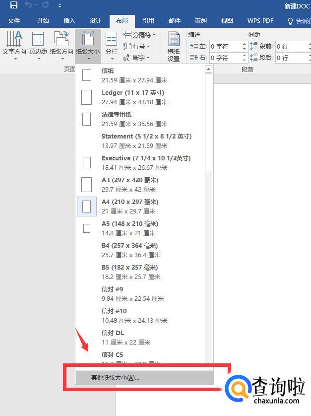 在纸张大小的下拉弹窗中,选择“其他纸张大小”。