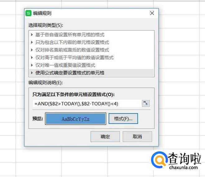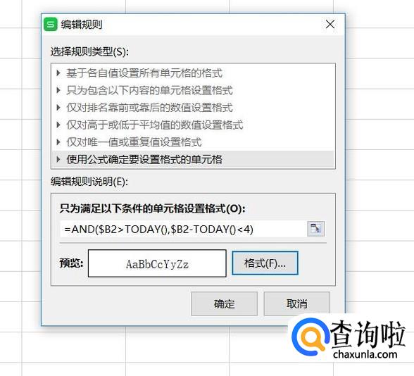 在规则类型中选择使用公式,并在下方的输入框中输入=AND(B2>TODAY(),B2-TODAY()<4)