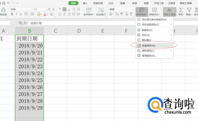 选择数据中的日期一列,在工具栏选择条件格式,新建规则