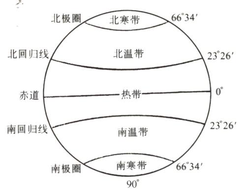 五带又称天文气候带、数理气候带,是根据太阳高度和昼夜长短随纬度的变化,将地球表面有共同特点的地区,按纬度划分为五个热量带,即热带、南温带、北温带、南寒带、北寒带。这种划分方法可初步反映各地获得太阳光热的多和少。是气候学上划分气候的基础。