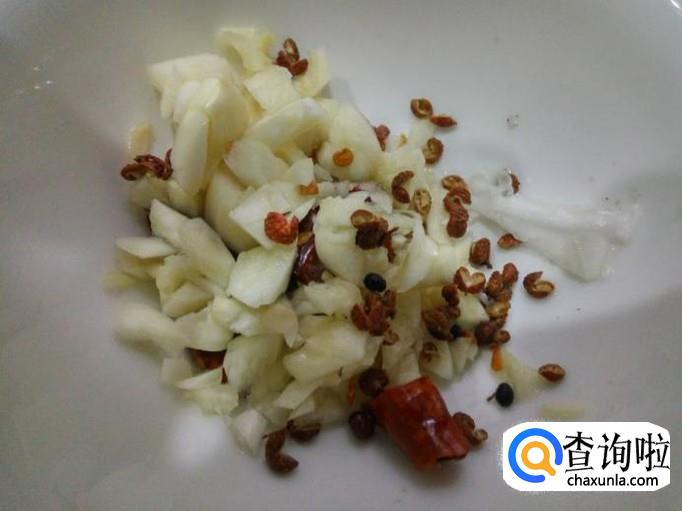准备几料大蒜头,去皮,剁成蒜泥;再准备一点花椒、干辣椒。