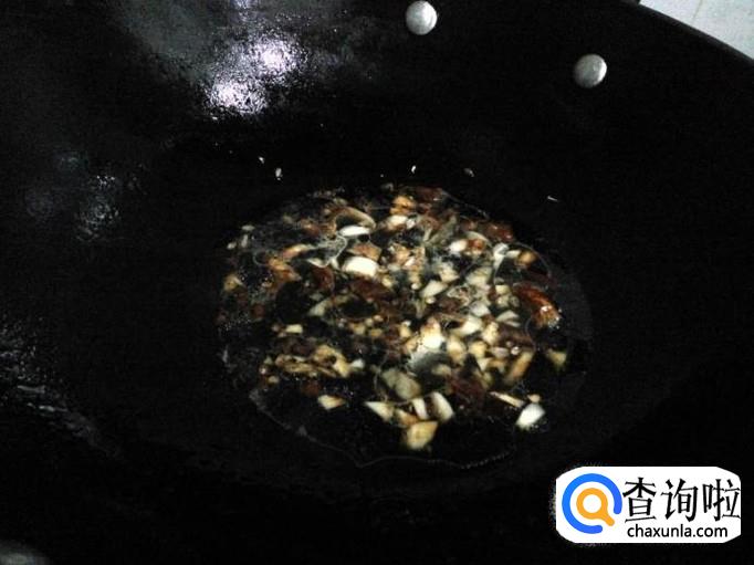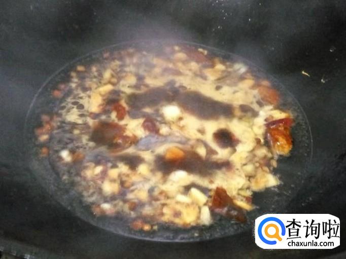 铁锅内放入适量食用油,然后倒入上述调料(蒜泥、花椒、干辣椒),略为干煸一下,再放入少量水、适量酱油和盐、黄豆辣椒酱。