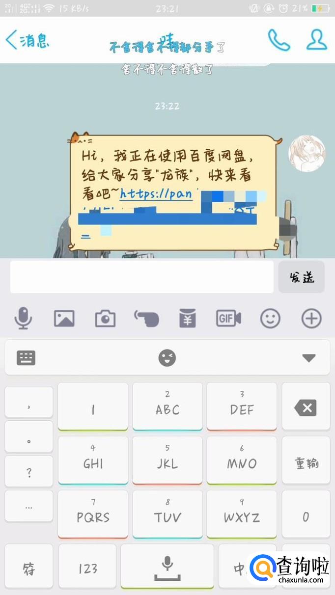 首先找到好友分享的资源,点击其中的百度云链接进入分享页面。