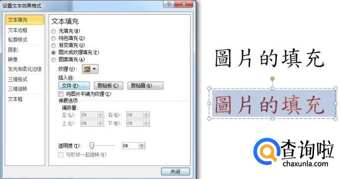 首先,选取需要填充图片的字体,右击,选择"文字效果格式",然后选择"文字填满"中的"图片或材质填满",最后可以选择本地图片或者系统中不同的材质来填满字体。
