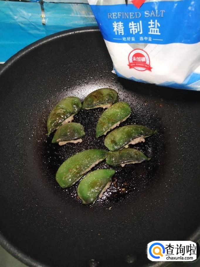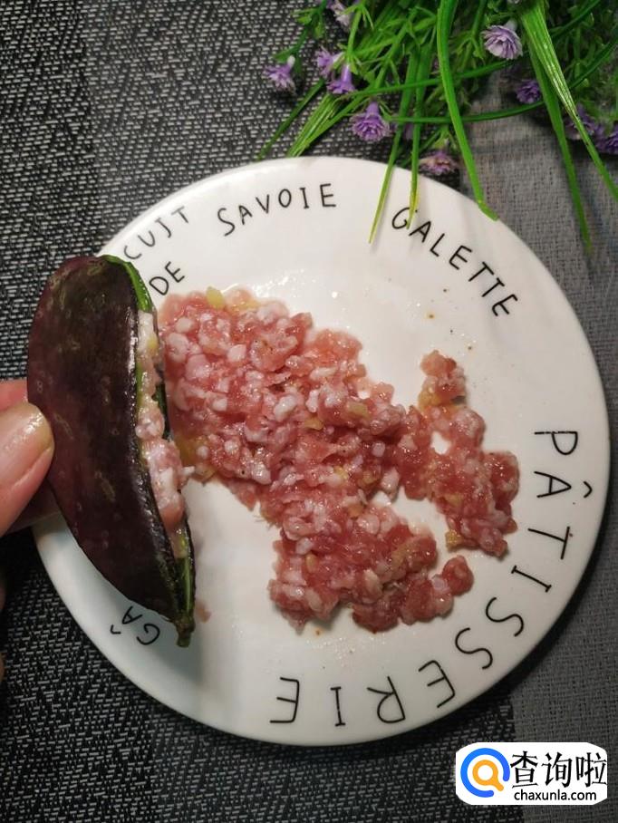 把腌好的五花肉塞进扁豆夹中间,全部塞好之后,放入盘中备用。