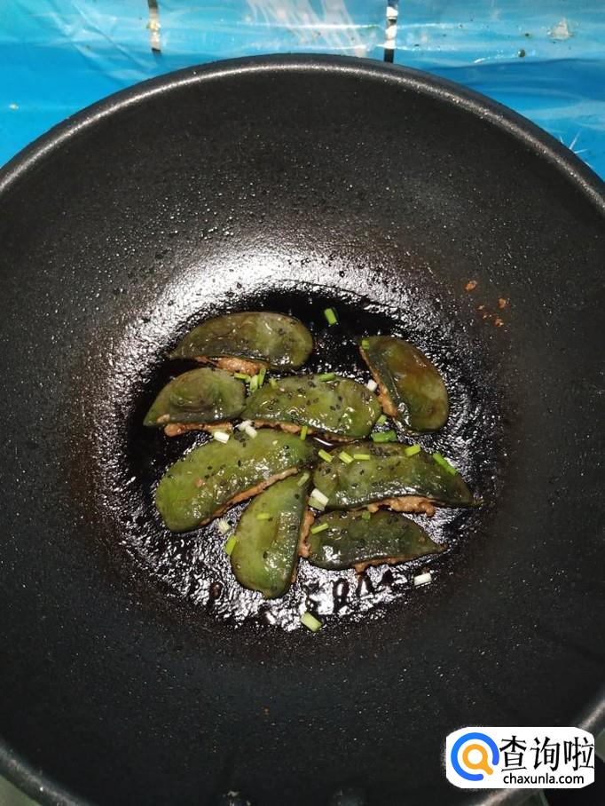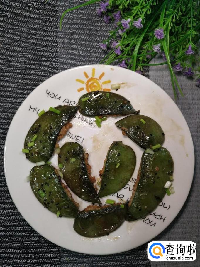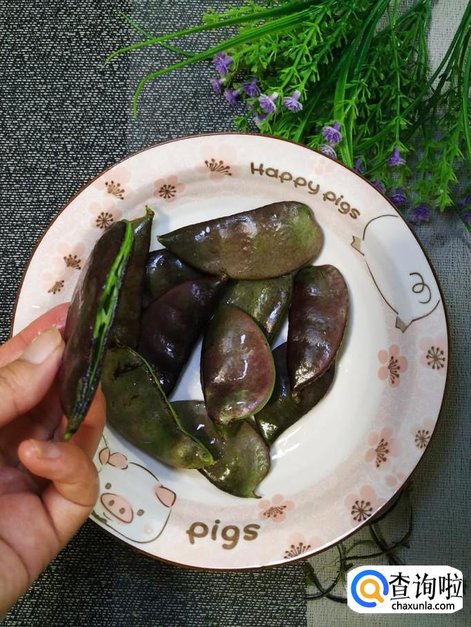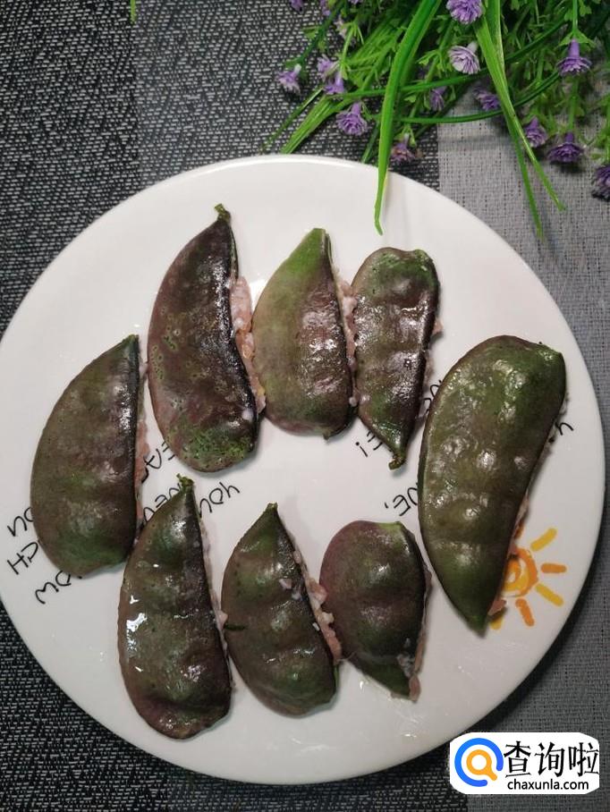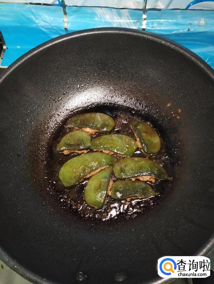准备适量新鲜的扁豆,将扁豆洗净后,撕去一边的豆筋,用手将扁豆的一边掰开,这样就形成了一个小袋子。