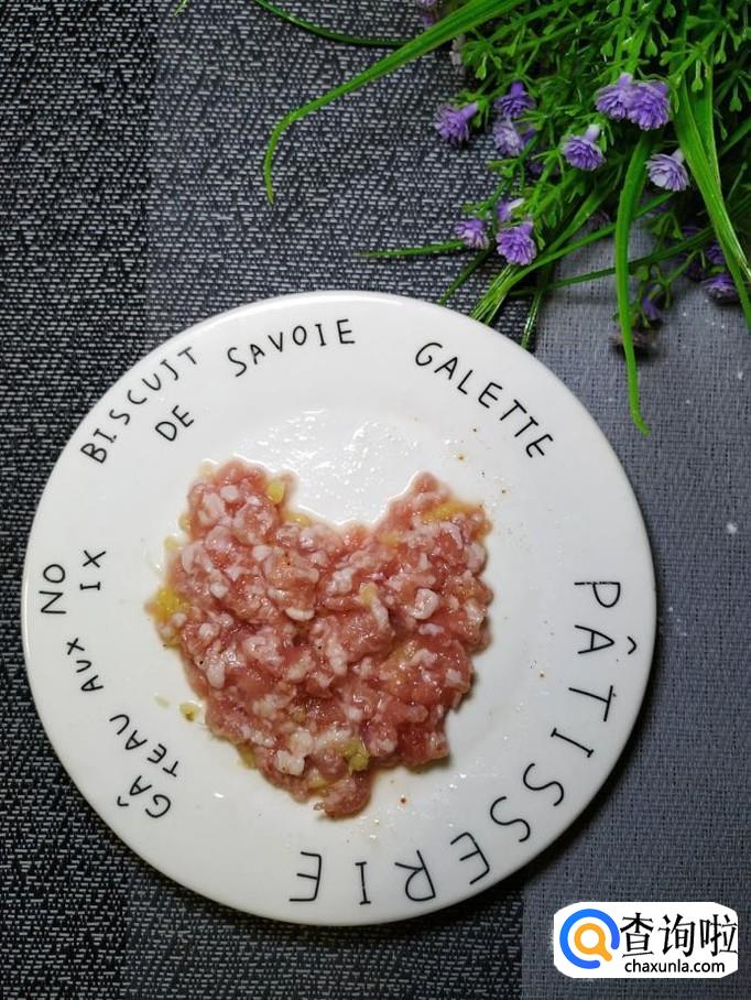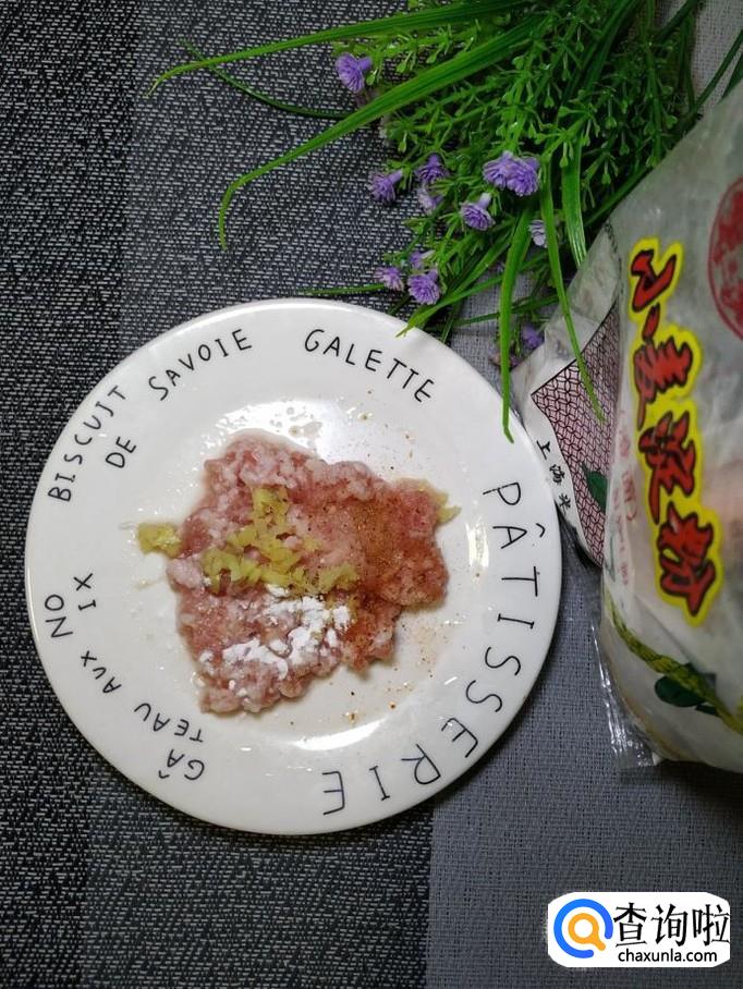 准备适量新鲜的五花肉,洗净后切碎,再准备适量生姜,洗净后切碎,和五花肉放在一起,放上适量盐,鸡精,五香粉,料酒,淀粉,搅拌均匀,腌制15分钟。