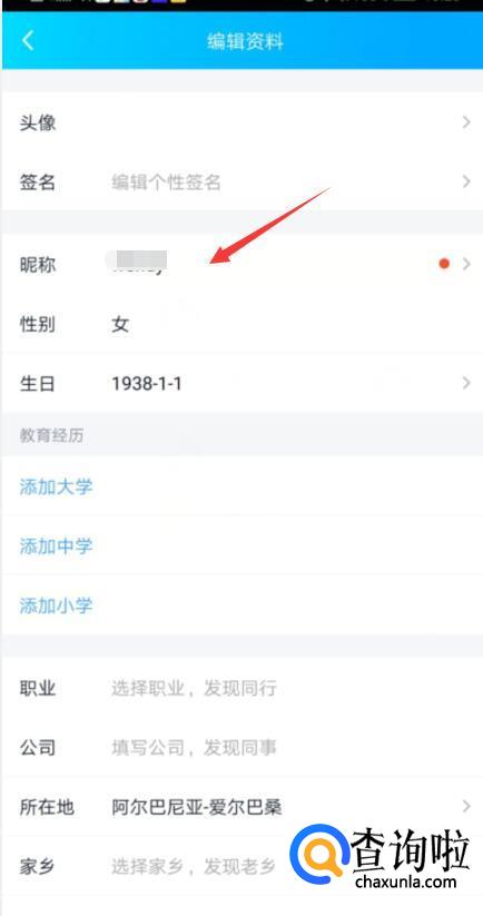在弹出的个人资料页面,点击昵称,如图所示: