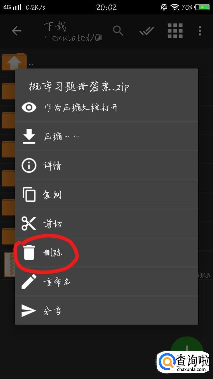 删除,长按压缩文件,选择“删除”,即可删除该压缩文件。