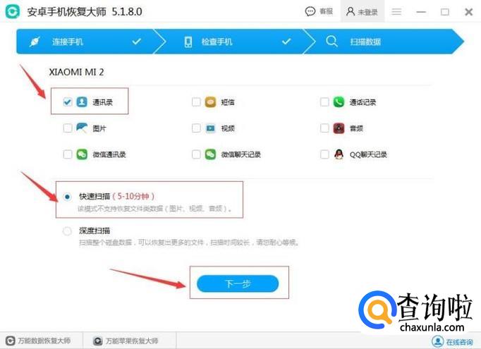 连接上手机后,弹出数据类型选择框,其中有多种类型可以选择,这里只需要勾选“通讯录”,选择快速扫描后,点击下一步。