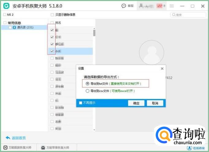 勾选自己需要的通讯录号码后,点击下方的恢复按钮,接着选择导出TXT模式,点击确定就可以了。