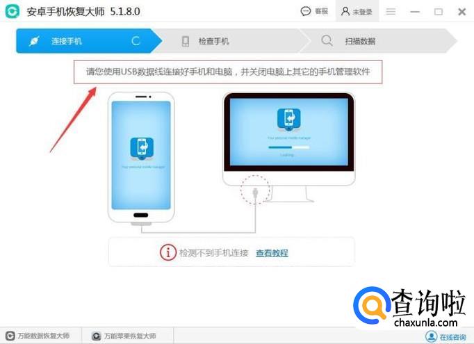 安装软件完毕,运行软件,我们可以看到提示“将USB数据线连接手机和电脑,并关闭电脑上的其它的手机管理软件”,按照操作执行即可。