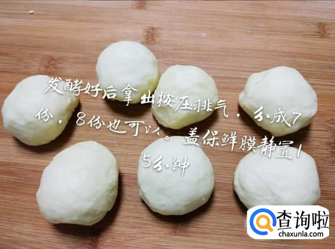 接着把面团分成,大小均匀的8份,盖上保鲜膜静置一个小时,如下图所示。