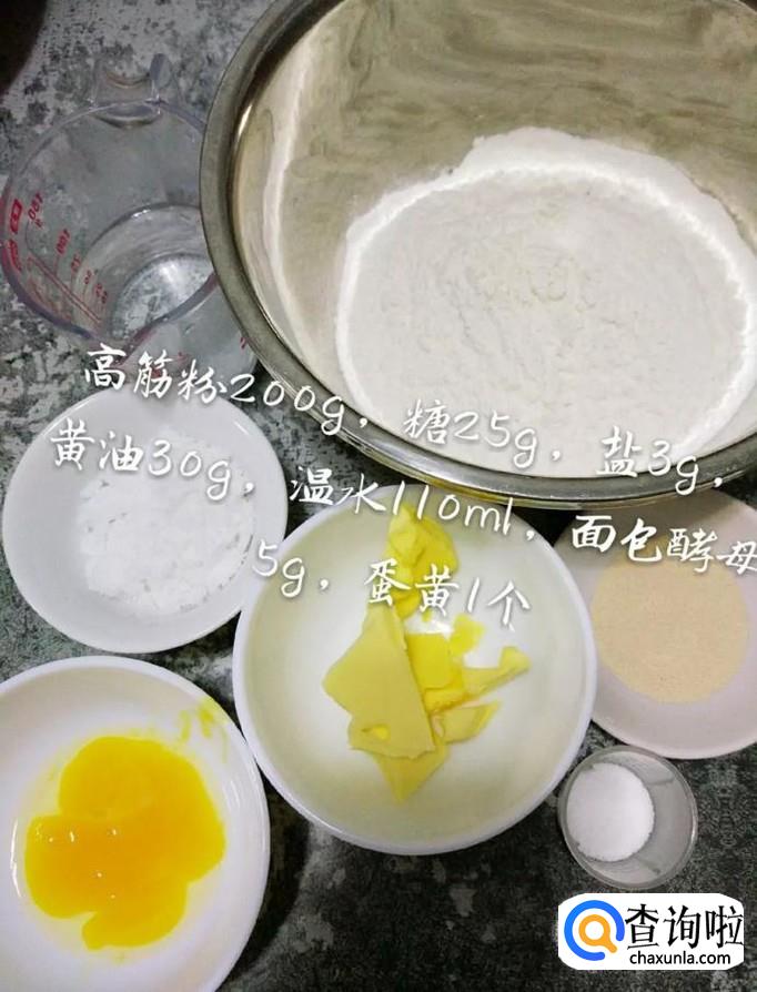 首先准备好所有要用到的食材,如下图所示。小贴士:高筋面粉200克,糖25克盐3克,黄油30克,温水110ml,酵母5克,蛋黄一个。