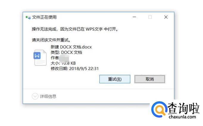 弹出提示,操作无法完成,而且给出了占用该文件的程序信息,这种情况,只需要关闭提示中的软件即可成功删除