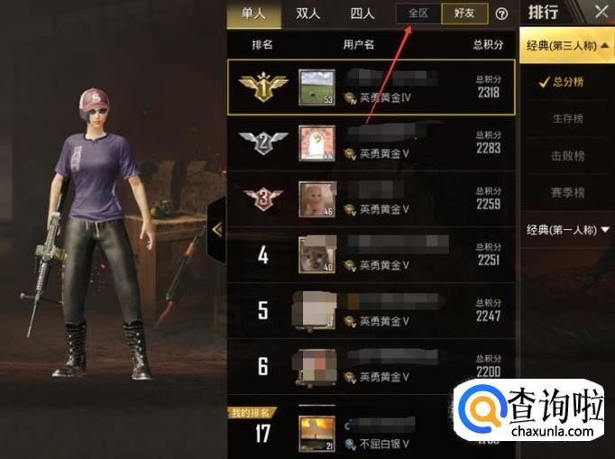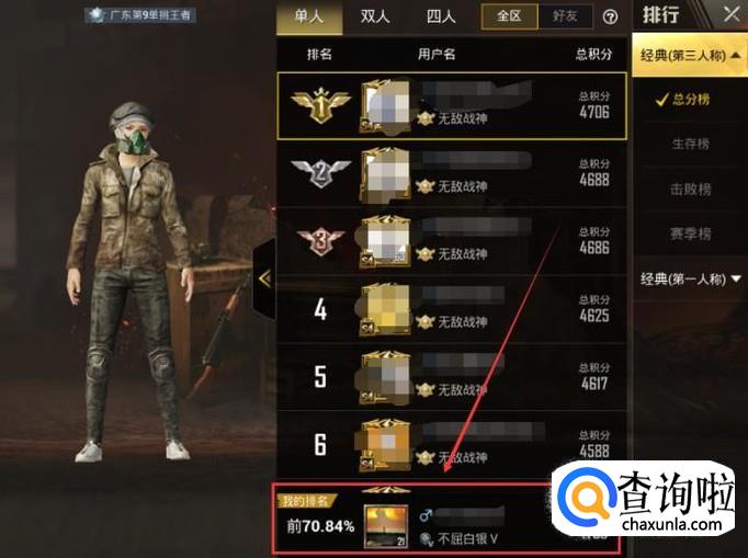 进入到【全区】页面后,在页面的底部玩家就能看到自己当前的全区排名了。