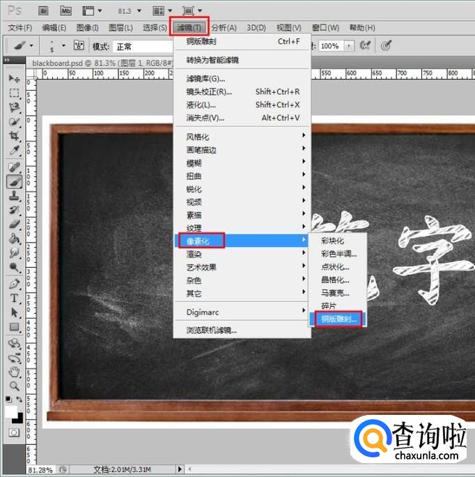 最后选择图层1,使用铜版雕刻工具,类型选择精细点,确认,粉笔字效果就出来了;