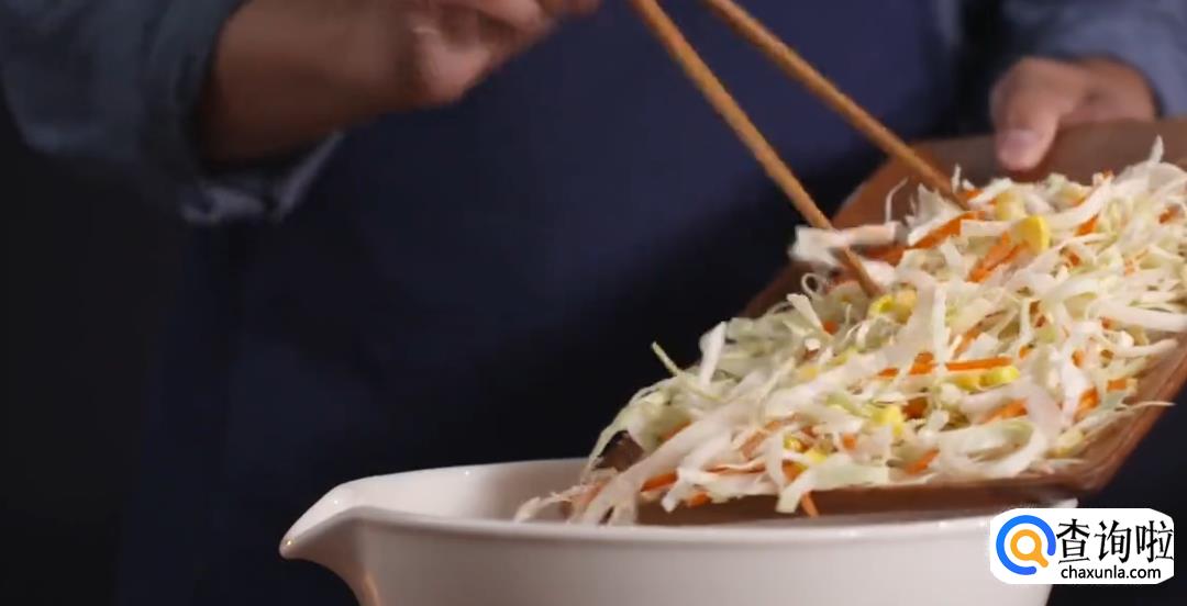放入卷心菜丝,胡萝卜丝,洋葱丝,玉米粒,混合搅拌均匀。