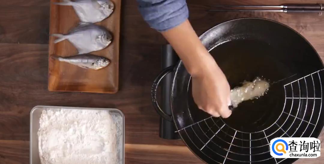 抖掉多余的面粉,放入七八成热的油中,炸2-3分钟。捞出沥干放置3分钟。