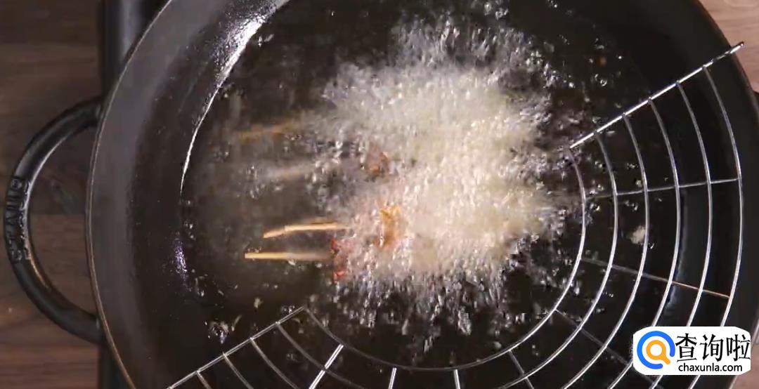 然后用漏勺盛出,放入七八成熟的油中,炸三分钟,待衣面色泽金黄即可。